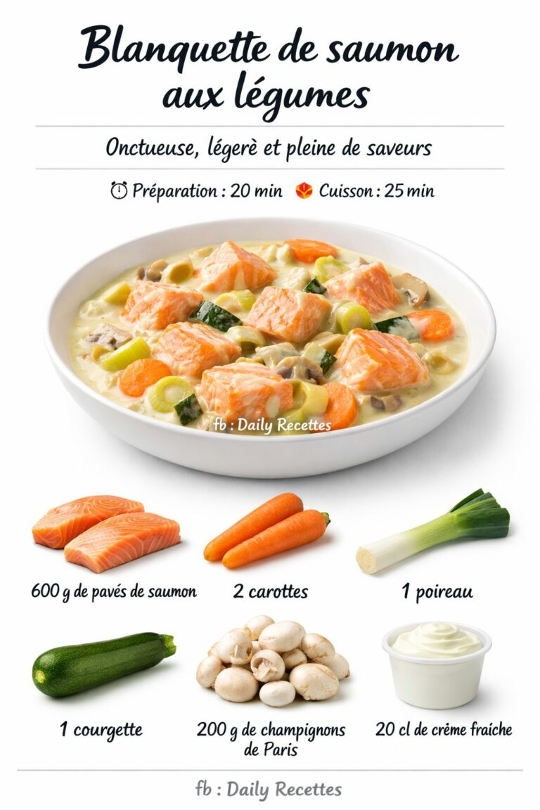 Délicate et raffinée, la blanquette de saumon aux légumes revisite un grand classique de la cuisine française en version plus légère. Ce plat onctueux, aux saveurs douces et équilibrées, est idéal pour un repas familial gourmand et réconfortant.