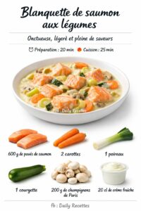 Délicate et raffinée, la blanquette de saumon aux légumes revisite un grand classique de la cuisine française en version plus légère. Ce plat onctueux, aux saveurs douces et équilibrées, est …