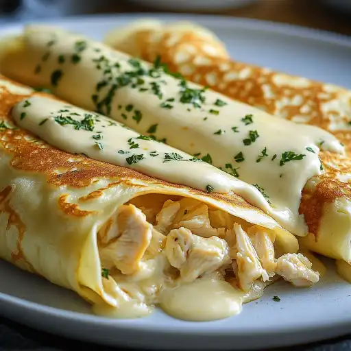 Description de cette recette Les crêpes fourrées au poulet et au fromage représentent un plat réconfortant et polyvalent, idéal pour un déjeuner rapide, un dîner familial ou même un brunch gourmand. Cette recette combine la simplicité des crêpes faites maison avec une garniture crémeuse et savoureuse à base de poulet, d’oignons, d’ail et d’un mélange de fromages fondants. Chaque bouchée offre une explosion de saveurs et de textures, avec la douceur des crêpes qui contraste merveilleusement avec le goût riche et umami de la garniture. Faciles à personnaliser, ces crêpes peuvent être adaptées selon les préférences de chacun, que ce soit en ajoutant des légumes, des herbes fraîches ou des épices pour relever le goût.