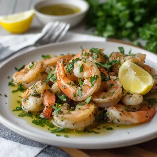 Étape 5: Finition et service. Retirez la poêle du feu et arrosez les crevettes avec le jus de citron frais. Ajoutez le persil haché, salez et poivrez au goût. Mélangez délicatement pour enrober les crevettes de la sauce. Servez immédiatement.