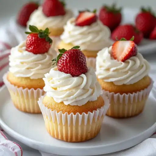 These delightful cupcakes combine the classic comfort of vanilla with the fresh, summery flavors of strawberry and whipped cream. Light, airy, and perfectly balanced, they’re ideal for any occasion, from a casual afternoon tea to a festive celebration. Each bite offers a harmonious blend of sweet vanilla cake and creamy, fruity topping.