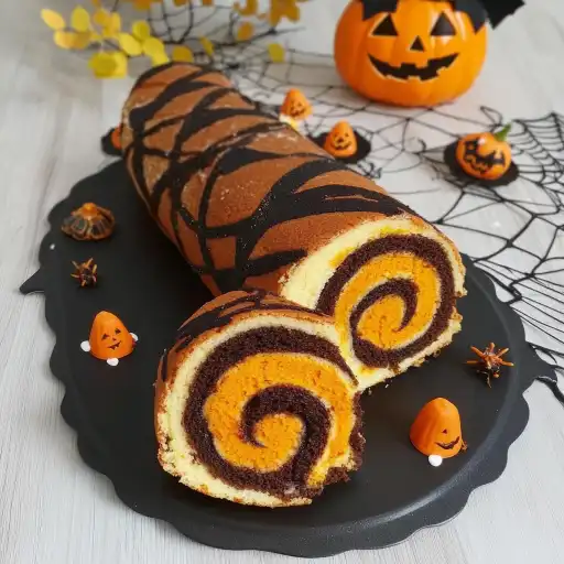 Ce gâteau roulé d’Halloween est une gourmandise festive et délicieuse, parfaite pour célébrer l’automne et la fête des morts. Avec ses couleurs vibrantes d’orange et de noir, et sa spirale élégante, il impressionnera vos invités et ravira les papilles de tous. La combinaison de la douceur du biscuit au chocolat et de l’acidité de la crème à l’orange (orange curd) est un pur délice.