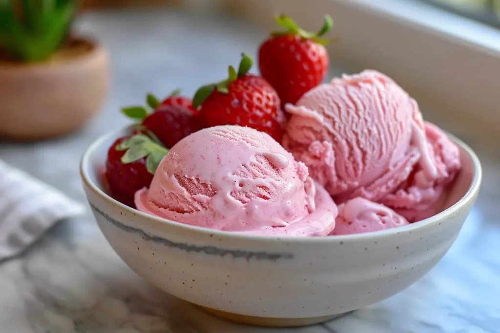 Délicieuse et crémeuse glace à la fraise maison, parfaite pour une friandise rafraîchissante lors d’une journée chaude.