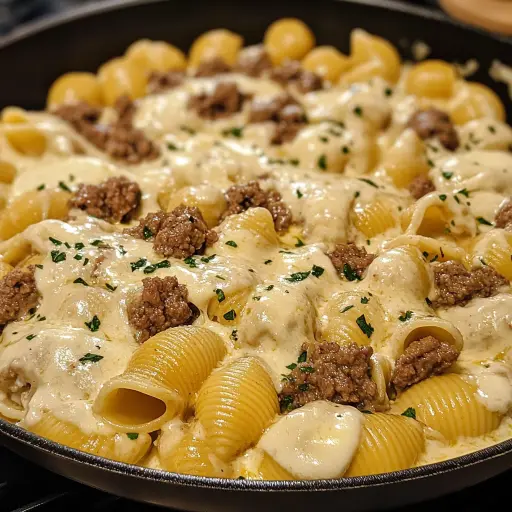 Pâtes aux Coquilles et Bœuf dans une Sauce Crémeuse à l’Ail et au Parmesan