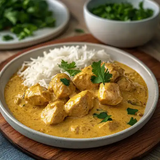 - Servez le poulet au curry crémeux chaud, accompagné de riz basmati.