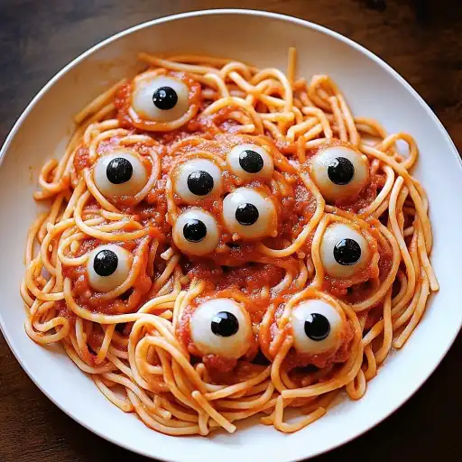 Préparez-vous à une expérience culinaire effrayante et délicieusement macabre avec cette recette de Spaghetti Ensanglanté aux Yeux Globuleux. Ce plat, parfait pour Halloween ou toute soirée à thème horrifique, combine des saveurs riches et réconfortantes avec une présentation visuellement saisissante. Imaginez des spaghetti enrobés d’une sauce rouge intense, parsemés de boulettes de viande monstrueuses, chacune ornée d’un œil globuleux noir. L’effet est à la fois répugnant et irrésistible, promettant de captiver et d’effrayer vos convives.